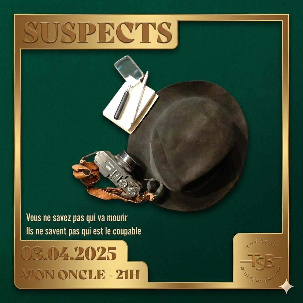 On se retrouve le vendredi 3 à 21h pour un nouvel épisode de suspects ! Le crime ou personne (pas même les comédiens) ne connaissent le tueur et c’est à vous public de trouver qui c’est !